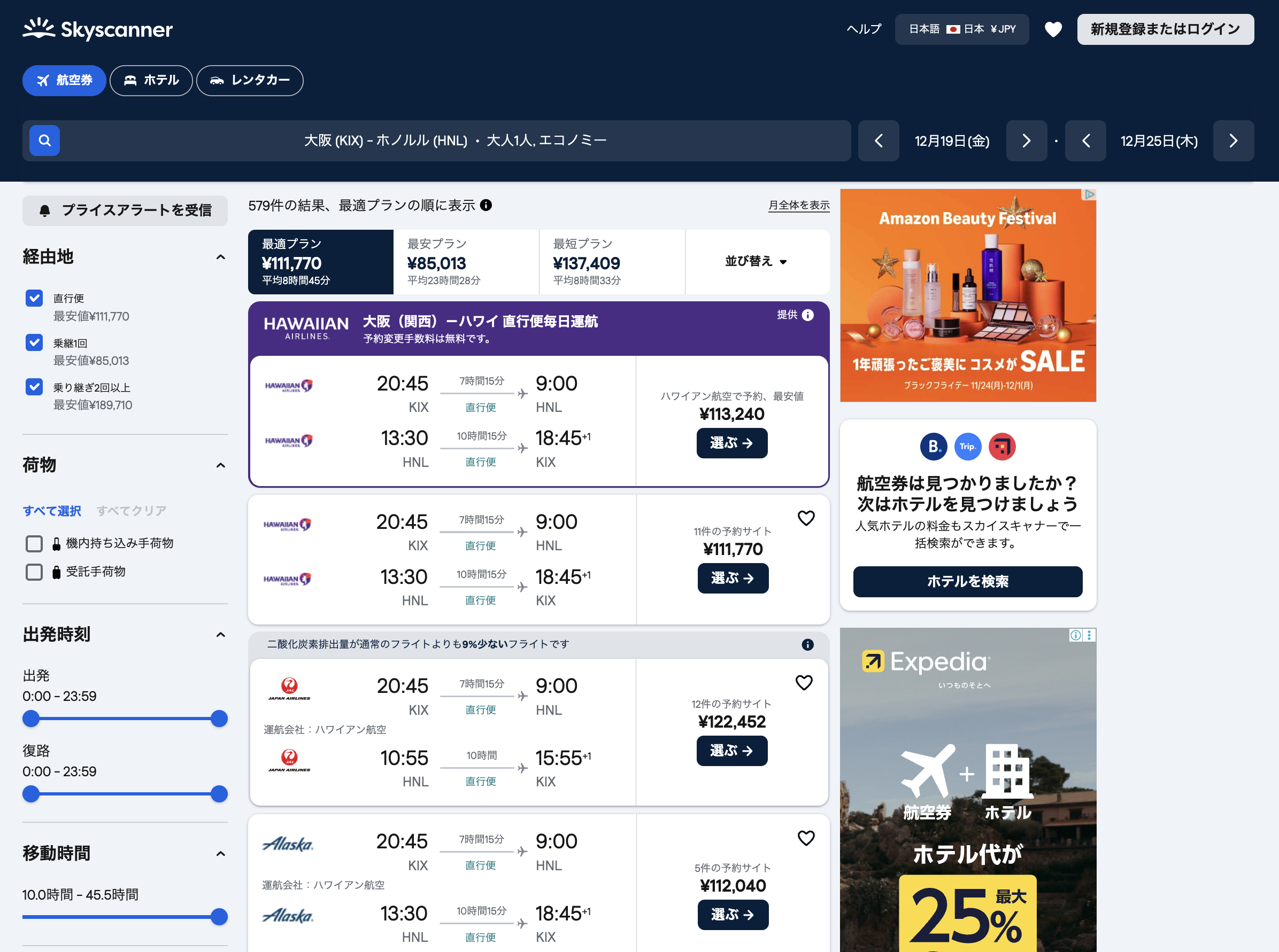 • ハワイアン航空、ANA、JAL、ZIPAIRなど、細かく自分で調整できる。