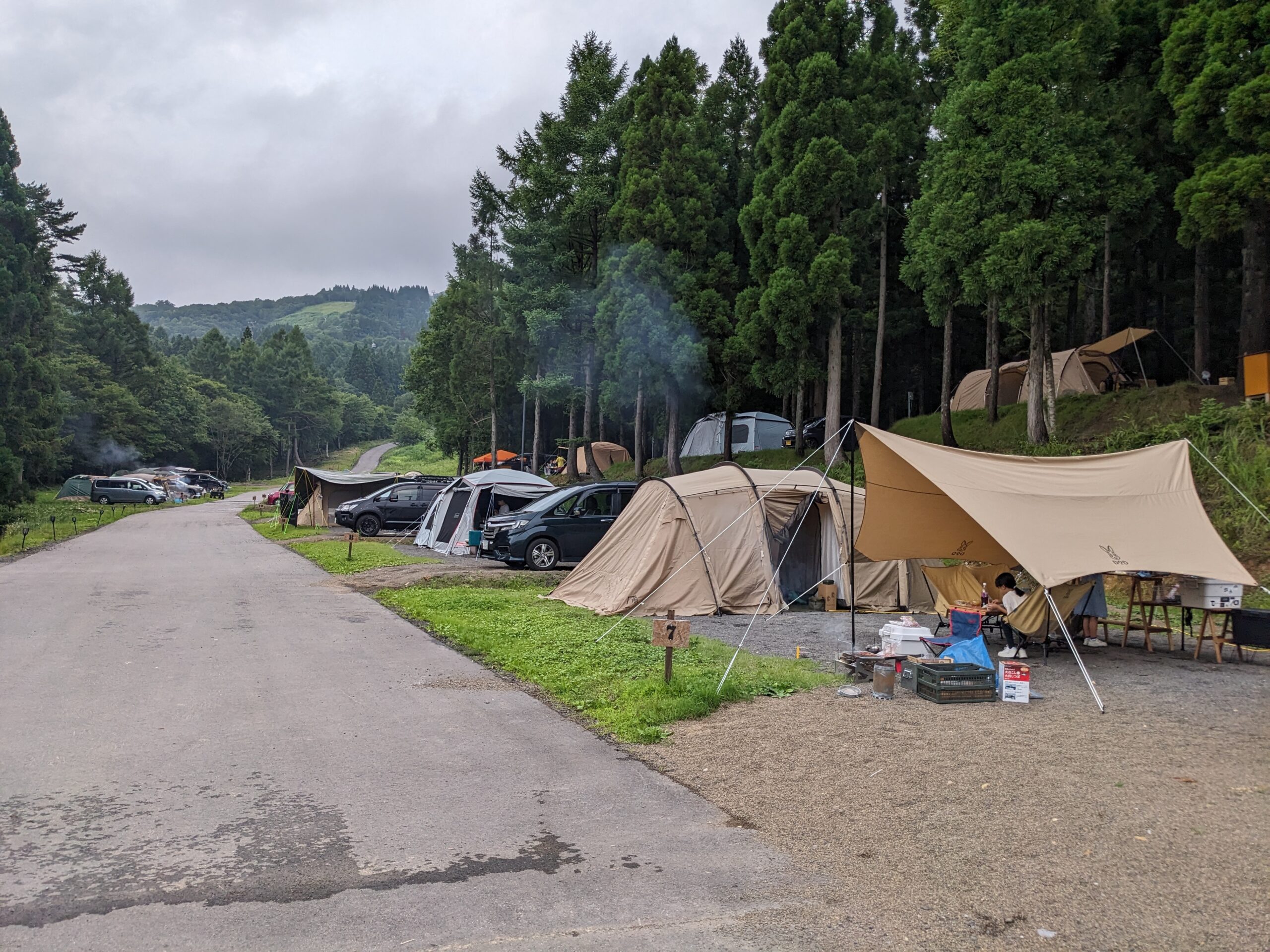 区画が狭いとテント+タープが張れません。