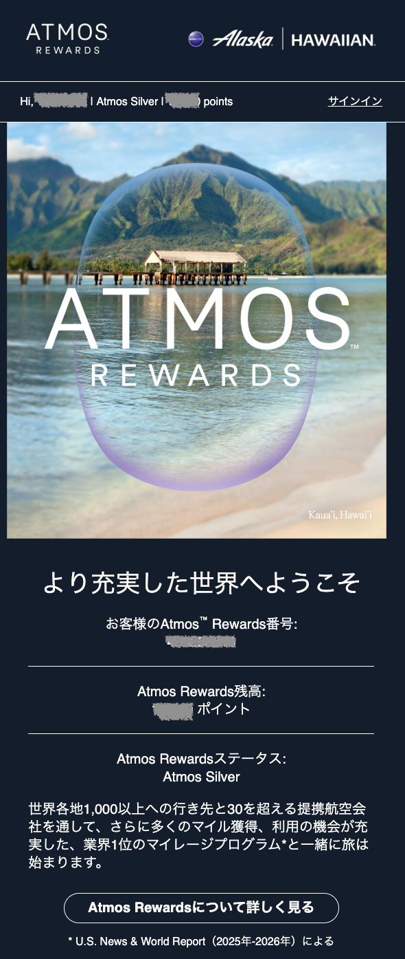 2025年10月1日をもって アラスカ航空(Alaska Airlines)との統合ロイヤルティプログラム「Atmos Rewards(アトモスリワード)」へ移行 しました。