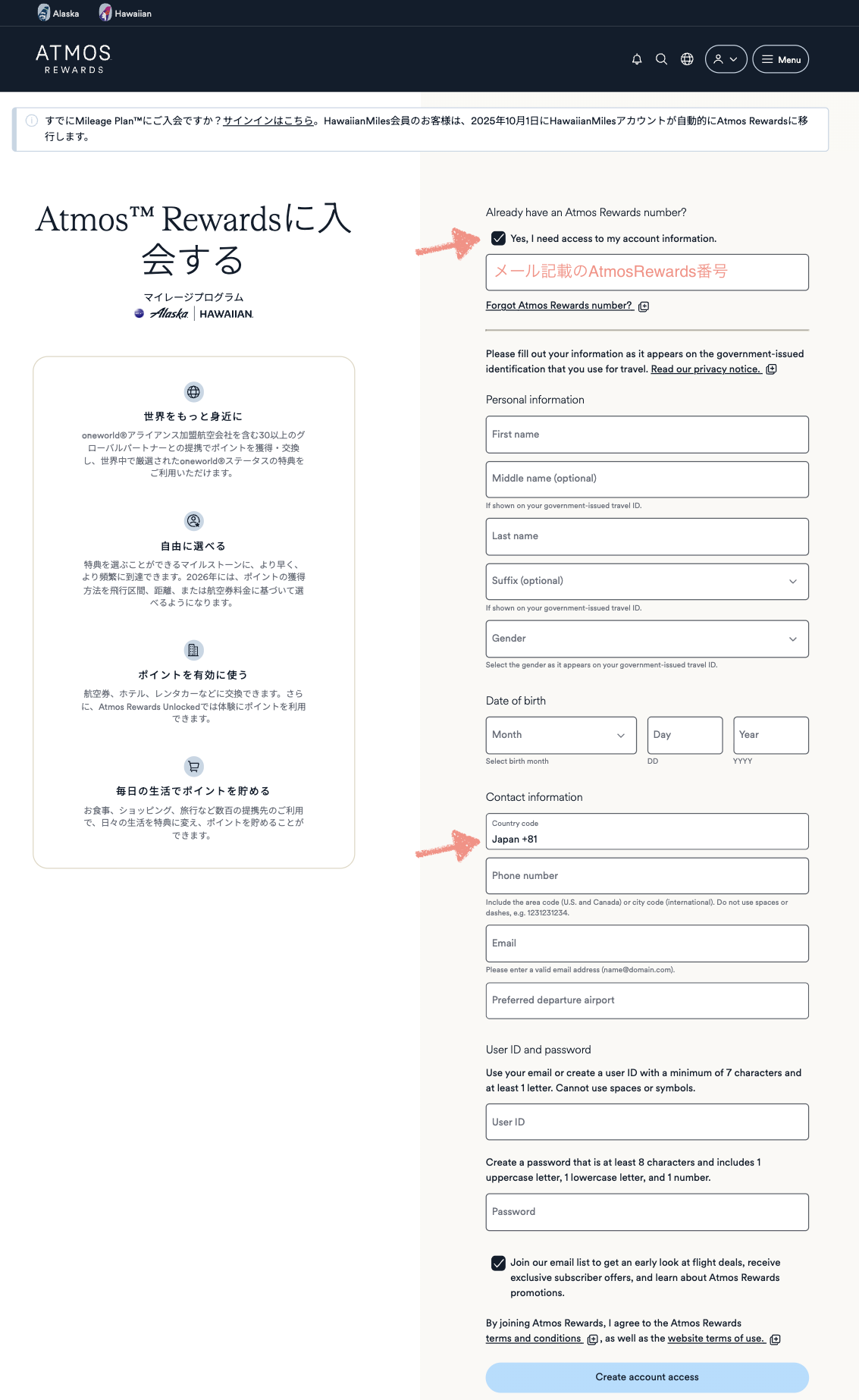 ハワイアン航空のアカウント情報はAtmos Rewardsへ移行されていないため