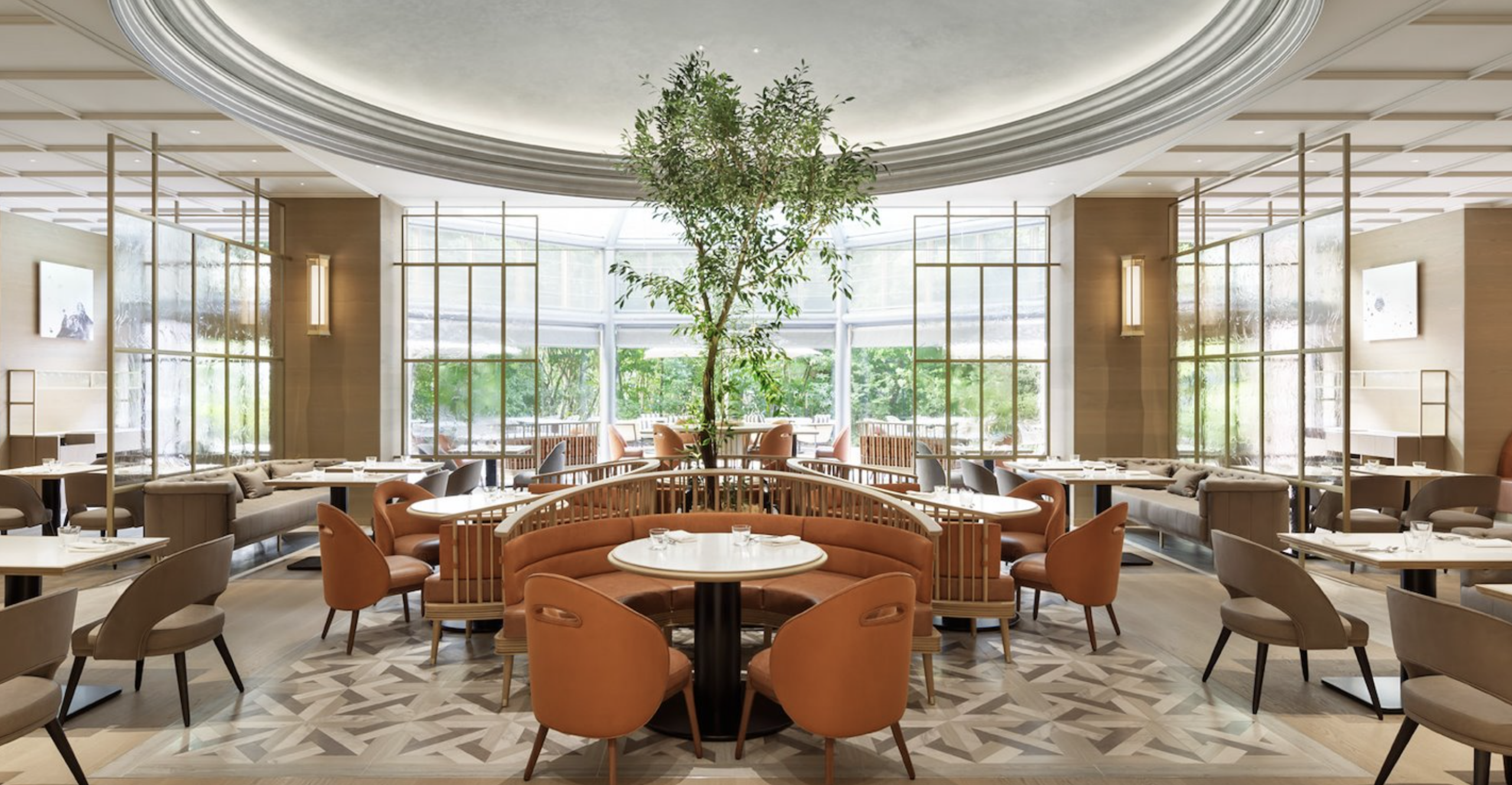 品川・御殿山の緑に囲まれた東京マリオットホテル1階、吹き抜けのアトリウムに広がる「ラウンジ&ダイニングG」。